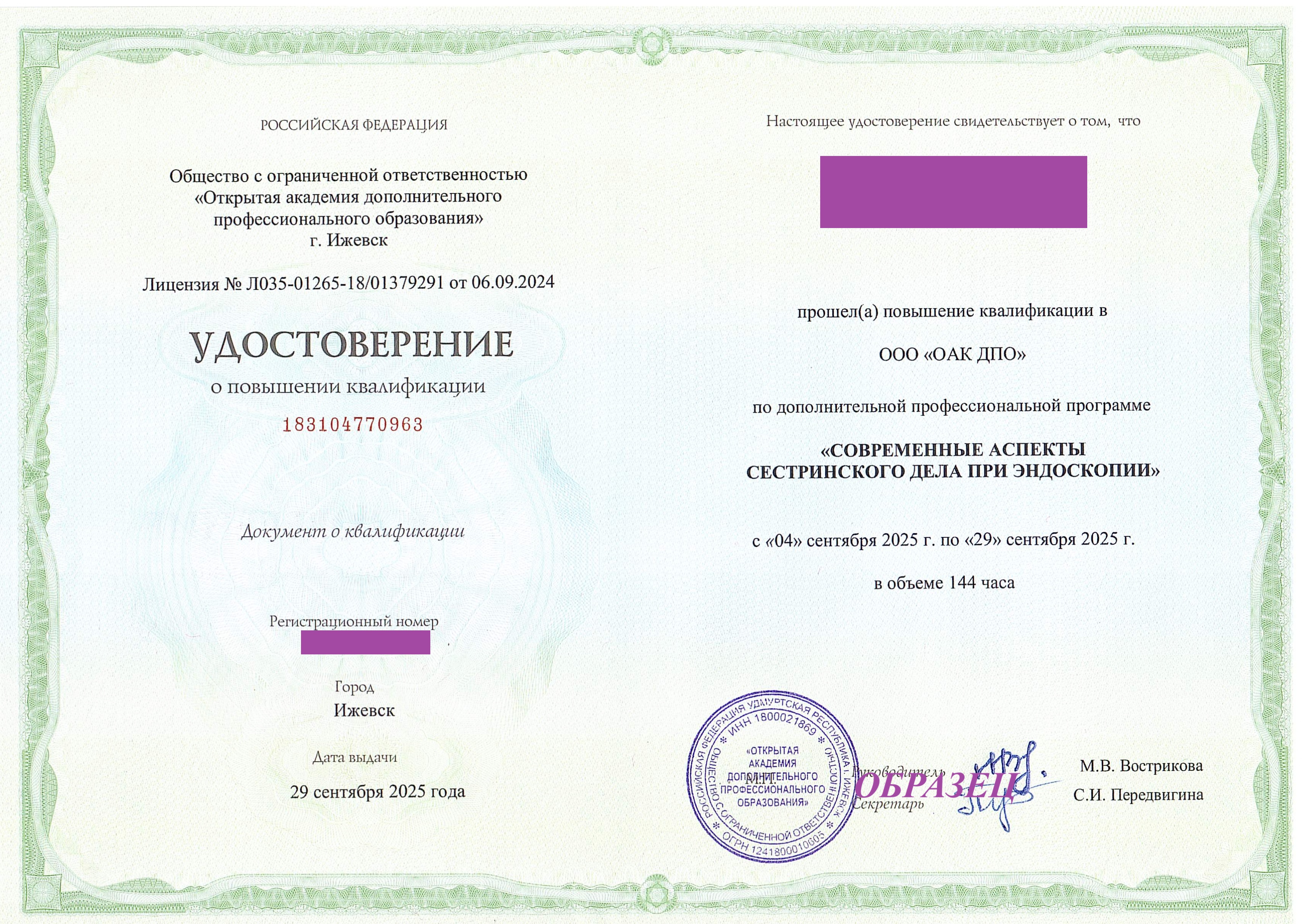 ООО «ОАК ДПО» ИНН: 1800021869 КПП:180001001 ОГРН: 1241800010605